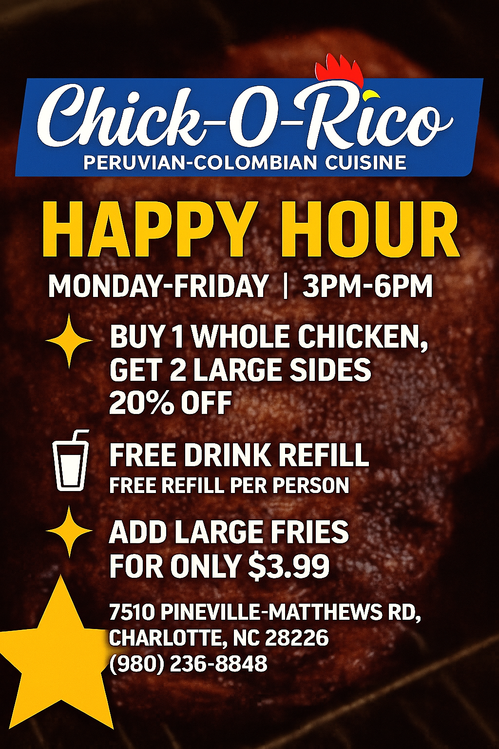 Come here for perfectly cooked ceviche, Rottiserie Chicken, Bandeja Paisa, Lomo Saltado, Arroz Chaufa, Chupe de Pescado, Aji de Gallina and more... our menu is fresh, flavorful, and packed with inspired recipes that will transport your taste buds to the streets of Peru and Colombia.